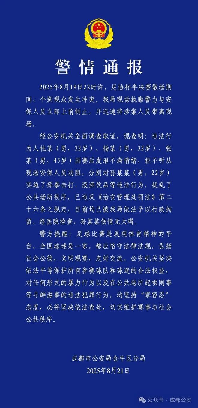 报道新闻记者说,陈·尤克西亚(Chen Yuxiao)在8月19日的足总杯半决赛中被河南队击败。比赛结束后,一些球迷在看台上发生了冲突。 21日上午,成都公共安全局的金尼乌地区分支发布了通知,三名击败人民的人是行政的。该通知说,大约在2025年8月19日22:00,在足总杯半决赛结束时,一些观众冲突。我们局的警察和安全人员立即退后一步,以停止此事,并迅速带走了现场参与的人。经过全面的调查和公共安全机构的证据,现在发现DU犯罪者(32岁),杨(男人,32岁)和张(男性,45岁)在比赛结束后带来了乐趣,并拒绝跟随现场安全人员的劝说。他们采取了非法行动,例如白天(男性,22岁),诸如拳击和飞溅饮料,这会干扰Wi遵守公共场所和违反《公共保障局罚款法》第26条的行为。它们是由我们局的行政管理根据法律管理的。医院检查后,Sun Moumou没有受到重伤。昆明报道说:“记者在采访中遭到殴打和受伤”:夏·穆莫(Xia Moumou)被限制了10天,该公司参与了20,000元人民币的记者。官方报告说:“加入了67.96升石油的50升燃油箱。”外部博客作者是否私人选择了国家第二层植物保护的“悬崖白菜”植物?重庆警方干预了调查。律师:Wang Meng的编辑,刑法编辑,审查,对Lei的光,请继续关注!