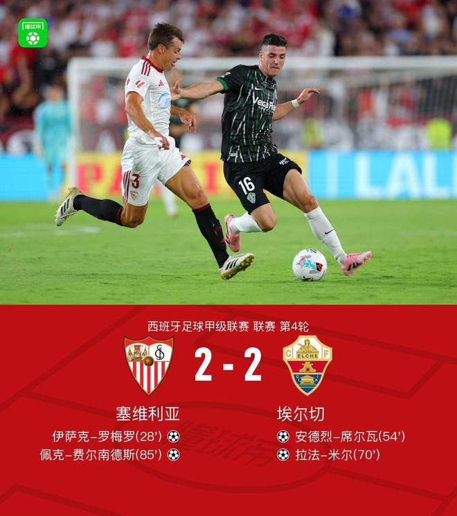 9月13日,北京时代,在西班牙足球联赛的第四个旋转中,塞维利亚在家里面对埃尔奇。比赛开始后,塞维利亚(Sevilla)是第一个摧毁僵局的人,鲁万·瓦尔加斯(Ruvan Vargas)提供了帮助,艾萨克·罗梅罗(Isaac Romero)成功得分。然后,埃尔奇(Elche)与安德烈·席尔瓦(Andre Silva)一起加入了玛蒂·内托(Matim Neto)。拉法·米尔(Rafa Mir)进入下半场,再次带领埃尔奇(Elche)。在比赛结束时,塞维利亚得到了桑切斯的协助,与佩克·费尔南德斯(Pec Fernandez)得分,双方最终以2-2握手,以实现和平。在关键事件的第28分钟,打破僵局,罗梅罗(Romero)进球得分,塞维利亚(Sevilla)取得了1-0 54分钟的进球,并获得了成功,安德烈·席尔瓦(Andre Silva)进球,埃尔奇(Elche)1-1 70分钟,拉法·米尔(Rafa Mir)直接帮助了一个自由踢,这与Elche 2在22ndelche的守门员中的比赛中获得了竞争,这是一场比赛,这是竞争对手的竞选,这是赛车赛中的竞选,这是在竞争中互相互动的,这是竞争对手的竞争,这是赛头的竞争,这是赛头的竞争。第28分钟打破了僵局,罗梅罗(Romero)射门令人惊叹,塞维利亚(Sevilla)得分1-0 33分钟,有些有趣,拉法·米尔(Rafa Mir)在第45分钟的进球,乔斯特(Chuster)和罗梅罗(Romero)。卡至4个后续镜头,但越位率不有效。在52分钟内,罗梅罗(Romero)得分很长,但他的队友首先犯规,但他的队友受到了不当的惩罚。在第54分钟的比分中,安德烈·席尔瓦(Andre Silva)在70分钟内得分1-1,抓住了,拉法·米尔(Rafa Mir)在第87分钟的比赛中取得了任意球,埃尔奇(Elche)在第87分钟以2-1得分,桑切斯(Sanchez)在脚跟上辅助了Pec Fernandez,等于Sevilla 2-2,塞维拉(Sevilla)在90分钟2-2中,赛车赛,赛车赛的赛车众多,但赛车众多,但一名赛车赛,但一名赛车赛,但赛车却被打得很顺利。