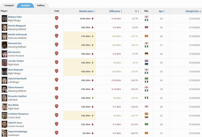 北京时间10月17日,德转更新了英超球员身价。阿森纳球员身价变化如下。然后,下降了1000万欧元,现在价值1.4亿欧元。 Edgo,下跌500万欧元,目前价值8000万欧元。马丁·苏比门迪,高达1000万欧元,现在身价7000万欧元。 Eze,高达1000万欧元,价值8000万欧元。哈弗茨身价6500万欧元,下跌500万欧元,现身价6000万欧元奥丁伯,升至500万欧元,现身价6000万欧元马杜埃克,升至1000万欧元,现身价5000万欧元马蒂内利,现身价1000万欧元,现身价4500万欧元恩瓦尔内里,下跌1000万欧元,现在价值 4500 万欧元 calafioli,高达 500万欧元,现身价4000万欧元 Ben-White,700万欧元,现身价3.8亿欧元 Christian Mosquera,高达500万欧元,现身价3500万欧元 Jesus,下降700万欧元,现身价2500万欧元凯帕,下降200万欧元,身价800万欧元【咪咕独家看英超】
